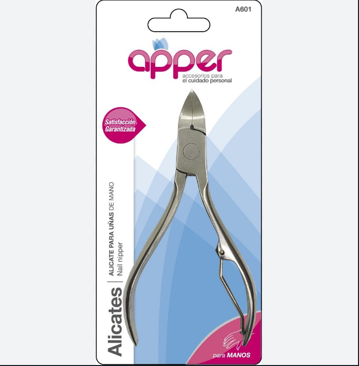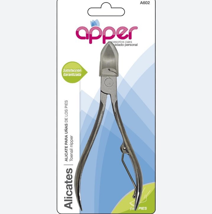 Alicate cortauñas curvo que otorga gran precisión de corte; mango plano, pulido y resistente; acero de carbono niquelado; resorte resistente con reductor que suaviza los movimientos con precisión; guía para el resorte.
